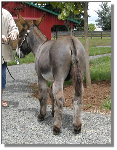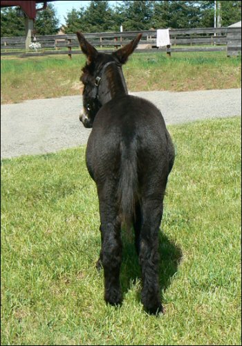 Pennington is a truly nice little jack. He is all that I hoped he would be. His temperament is very loving & sweet and he always comes running when I call his name because he knows it's time for scratches and sometimes a carrot if he's really good!! I have always had Pennington in his own stall/pasture beside the girls...he likes his own 'space' and keeps it very clean, but he likes to be around the herd and be included, too. Pennington's foals have all been really nice and colorful. He has spots on his maternal side, and can throw dark spots when bred to spotted jennets (see Jolie' on the sale page). But those solid black's are stunning: Cole-Porter Black and Little Black Bentley, both are very eye-catching. But one of my favorites is Grayson, a gorgeous blue/gray boy. Pennington is a very versatile guy!!